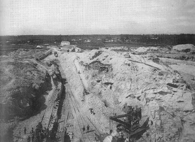 Molhe Norte em construção, foto de 1913 - esta foto está ao contrário, pois o molhe deveria virar para a direita, lado Norte. O barco ao longe, à esquerda, será o Veronese encalhado e é bem visível a…
