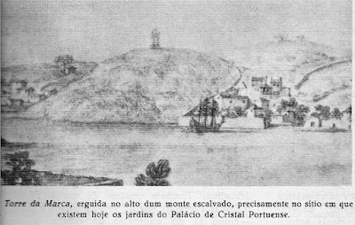 Este desenho foi feito exactamente do mesmo local da gravura de Manuel Marques de Aguilar, acima – as pedras no chão pertenciam à Torre da Marca, destruída pela artilharia de D. Miguel durante o cerco de 1832, pedras estas que foram utilizadas na construção da Capela de Carlos Alberto, no Palácio, a poucos metros.