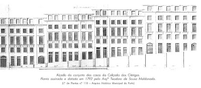 A muralha Fernandina passava pelo local onde estão construídas as casas do lado Sul da Rua dos Clérigos. “As demolições (desta parte da muralha) começariam a partir de 1787. Nesse ano, o Presidente da Junta pediria para Lisboa a autorização necessária para ser apeada a muralha do “lado meridional” da Rua dos Clérigos, não só porque ameaçava ruína, mas também porque permitiria o seu alinhamento… O derrube da muralha do lado Sul da Rua dos Clérigos, permitiria, para além do alinhamento referido, abrir uma rua que faria a comunicação entre aquela rua a a chamada Rua de Trás (actual Rua do Arquitecto Nicolau Nazoni). A raínha autorizou os proprietários possuidores de casas encostadas à muralha, ou a ela contíguas que pudessem “adianta-las e crescer com ellas até o alinhamento regular da referida rua; sujeitamdo-se eles a fazer as frentes que para ela ficarem segundo o prospecto, e plano aprovado e posto em execução nas outras propriedades situadas na mesma rua”. A área demolida não se confinaria só ao lado sul da Rua dos Clérigos. Foi autorizado o apeamento da muralha desde a Porta dos Carros (em frente à Igreja dos Congregados) até à Igreja dos Clérigos." In O Porto na Época dos Almadas de Joaquim Jaime B. Ferreira Alves