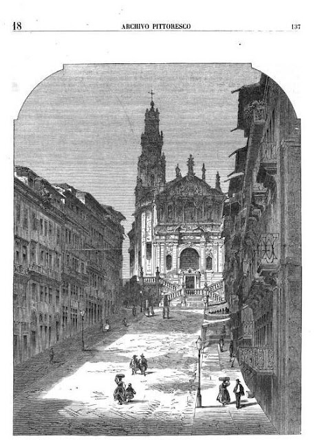 “A calçada dos Clérigos desce com bastante declive desde a frontaria do templo até á praça de D Pedro. Prestando-se, pela sua muita largura a ser guarnecida de arvoredo, mandou a câmara municipal modernamente plantar dois renques de arvores um de cada lado junto aos passeios. Quando o sr. Seabra tirou a photographia de que é cópia a nossa gravura, ainda não existiam alli as arvores, e era macadamisada. Actualmente está calçada com pedras cúbicas, todas de eguaes dimensões. É a calçada dos Clérigos um dos sítios mais concorridos do Porto. Deve esta vantagem a diversas circunstâncias taes como: a sua visinhança de parte do principal mercado público, e da outra, da praça de D. Pedro, e de outras ruas onde o movimento commercial é mais activo; as lojas de variados objectos que a guarnecem; e a ser a mais bela communicação da cidade baixa para a alta. O mercado do Anjo, assim chamado por ter sido edificado no logar dantes ocupado pelo recolhimento d'aquella denominação, fica ao norte da egreja dos Clérigos, apenas separado d'ella por uma rua. As lojas referidas encerram, no maior número, fazendas de seda, lã, linho e algodão, e muita diversidade de objectos de moda, porcelanas, cristaes, bronzes etc. Nenhuma se faz notar pela elegancia da armação, nem pela bonita disposição dos productos, mas algumas são notaveis pela muita cópia, e mesmo pela riqueza d'estes últimos.” I de Vilhena Barbosa in Archivo Pittoresco, Ano de 1864 -  Do Blog Porto Antigo